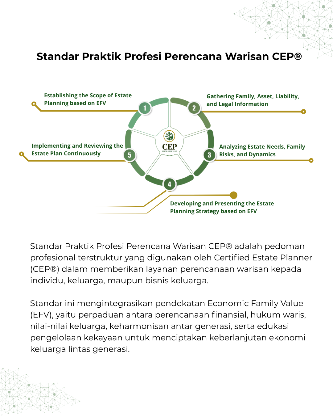 •  Implementasi Economic Family Value (EFV): Inilah seni utama CEP®, bukan sekadar membagi aset secara matematis, tetapi memastikan keberlanjutan ekonomi keluarga, menjaga keharmonisan hubungan antar generasi, memitigasi risiko konflik, serta memenuhi kewajiban pajak dan tanggung jawab legal secara terencana.